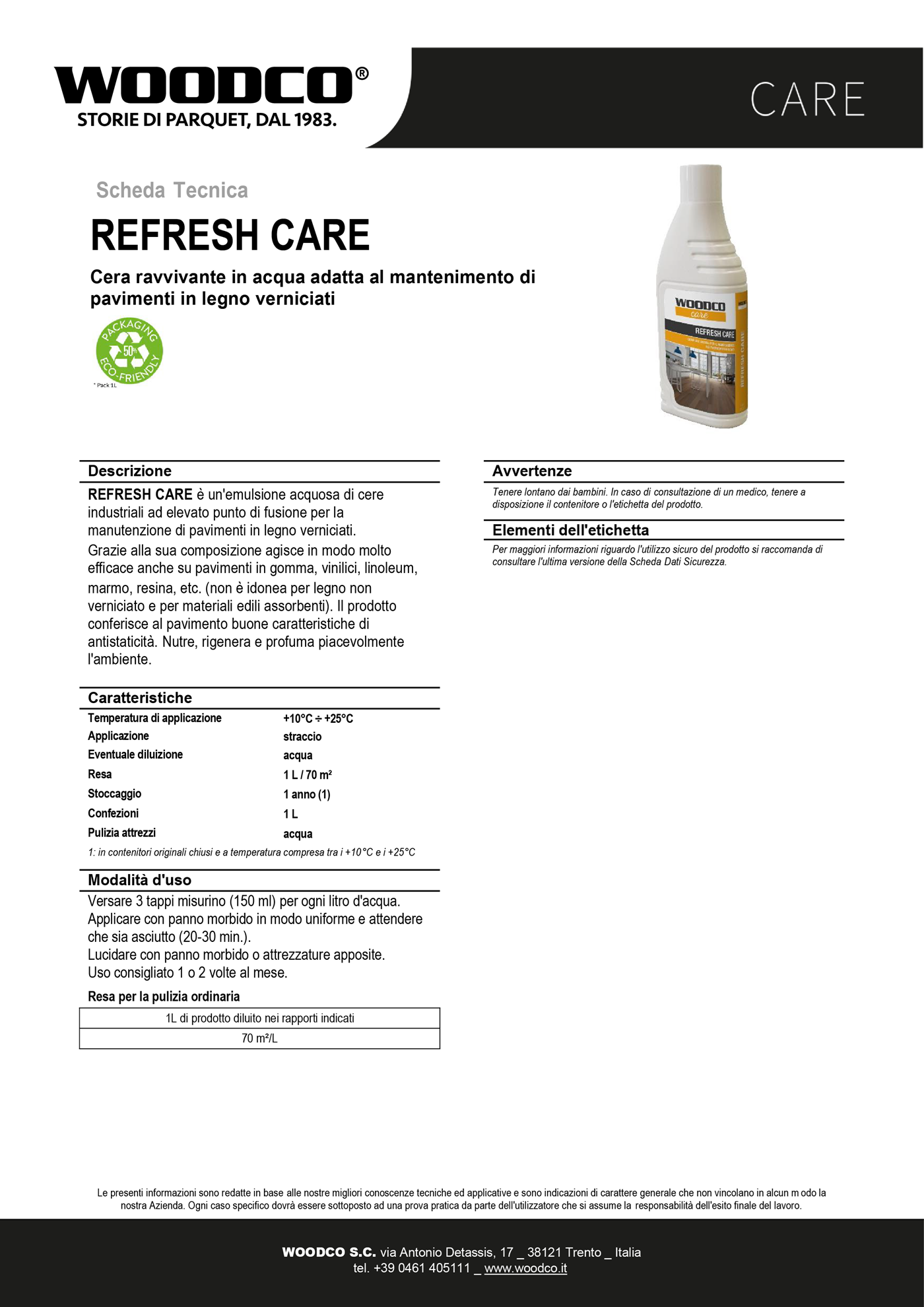 Refresh Care è una cera ravvivante all’acqua per la manutenzione di pavimenti in legno verniciati. Grazie alla sua composizione agisce in modo molto efficace anche su pavimenti in gomma, vinilici, linoleum, marmo, resina, etc. (non è idonea per legno non verniciato e per materiali edili assorbenti). Il prodotto conferisce al pavimento buone caratteristiche di antistaticità. Nutre, rigenera e profuma piacevolmente l’ambiente. Modalità d’uso: Versare 3 tappi misurino per ogni litro d’acqua. Applicare con panno morbido in modo uniforme e attendere che sia asciutto (20-30 min.). Lucidare con panno morbido o attrezzature apposite. Uso consigliato 1 o 2 volte al mese.