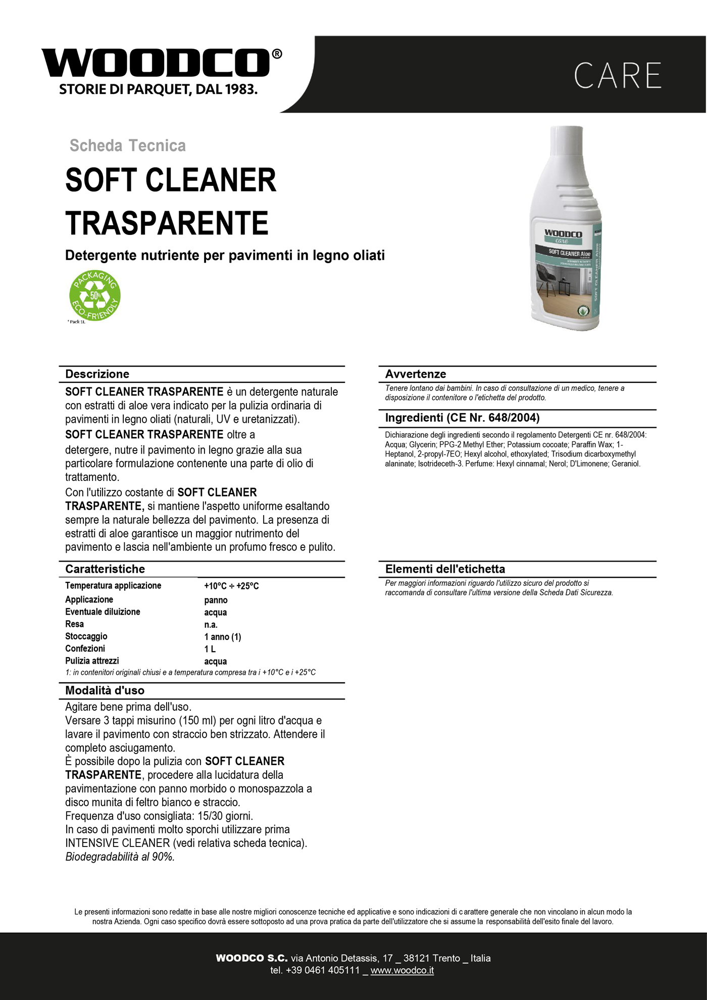 Soft Cleaner Aloe è un detergente naturale con estratti di aloe vera indicato per la pulizia di pavimenti in legno oliati (naturali, UV e uretanizzati). Soft Cleaner Aloe oltre a detergere, nutre il pavimento in legno grazie alla sua particolare formulazione contenente una parte di olio di trattamento. Con l’utilizzo costante di Soft Cleaner Aloe, si mantiene l’aspetto uniforme esaltando sempre la naturale bellezza del pavimento in legno. La presenza di estratti di aloe garantisce un maggior nutrimento del pavimento e lascia nell’ambiente un profumo fresco e pulito.Modalità d’uso: agitare bene prima dell’uso. Versare 3 tappi misurino per ogni litro d’acqua e lavare il pavimento con straccio ben strizzato. Attendere il completo asciugamento. Lucidabile con panno morbido o attrezzature apposite.Frequenza d’uso consigliata: 15/30 giorni.