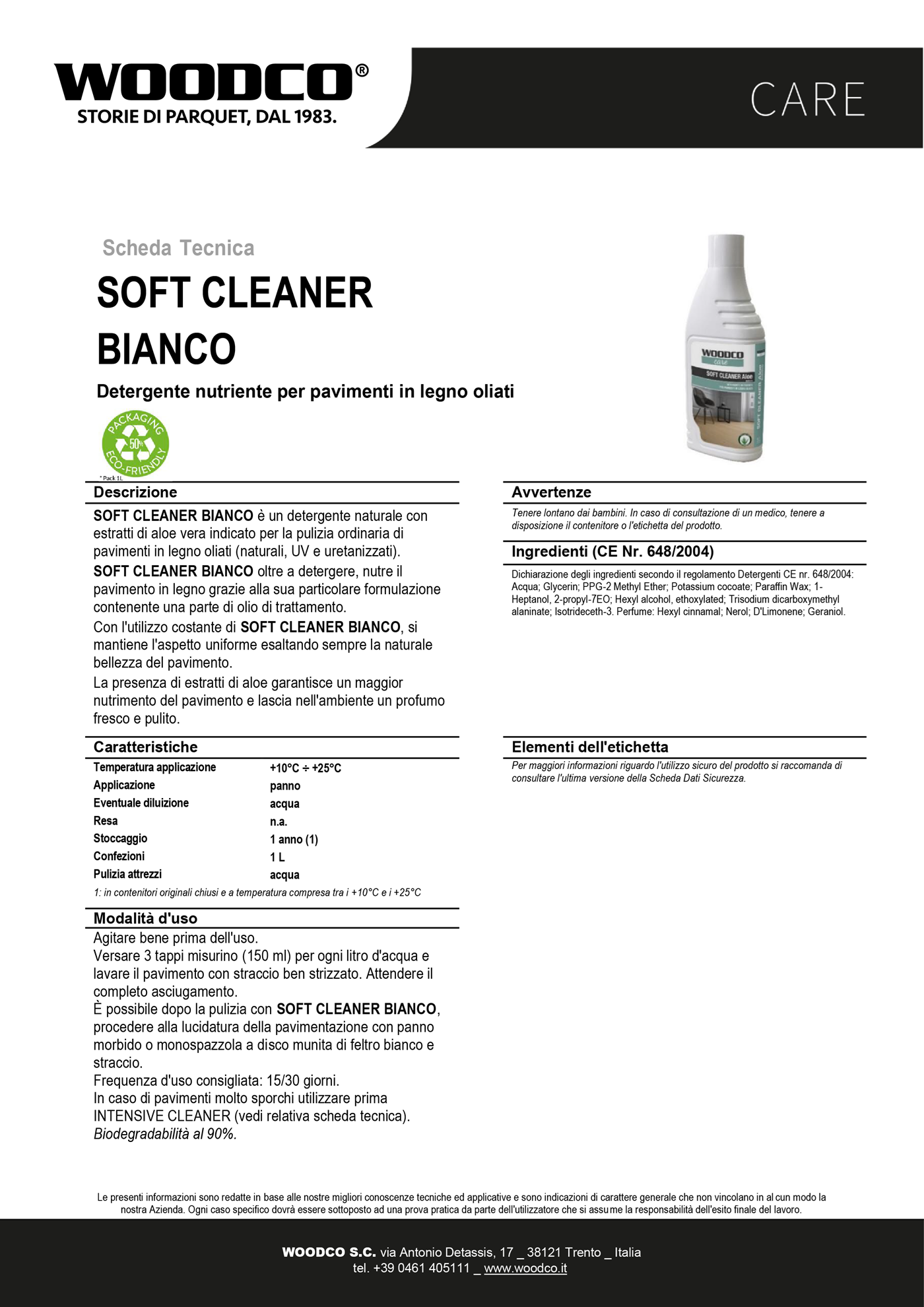 Soft Cleaner Aloe è un detergente naturale con estratti di aloe vera indicato per la pulizia di pavimenti in legno oliati (naturali, UV e uretanizzati). Soft Cleaner Aloe oltre a detergere, nutre il pavimento in legno grazie alla sua particolare formulazione contenente una parte di olio di trattamento. Con l’utilizzo costante di Soft Cleaner Aloe, si mantiene l’aspetto uniforme esaltando sempre la naturale bellezza del pavimento in legno. La presenza di estratti di aloe garantisce un maggior nutrimento del pavimento e lascia nell’ambiente un profumo fresco e pulito.Modalità d’uso: agitare bene prima dell’uso. Versare 3 tappi misurino per ogni litro d’acqua e lavare il pavimento con straccio ben strizzato. Attendere il completo asciugamento. Lucidabile con panno morbido o attrezzature apposite.Frequenza d’uso consigliata: 15/30 giorni.